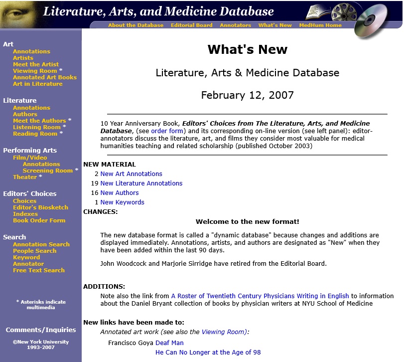 I think it is different from the database, and that’s good. It’s fine. You have your own vision of what you’d like to accomplish, and I think it’s working well, you’ve recruited people who’ve written some interesting things, not annotations, but more like essays. And you’ve expanded it so you have included art. I don’t know what else you’re planning to do, but I think it’s a good site, it’s valuable. It’s nice to have something up there that’s medical humanities related. And I really admire what you’ve done.